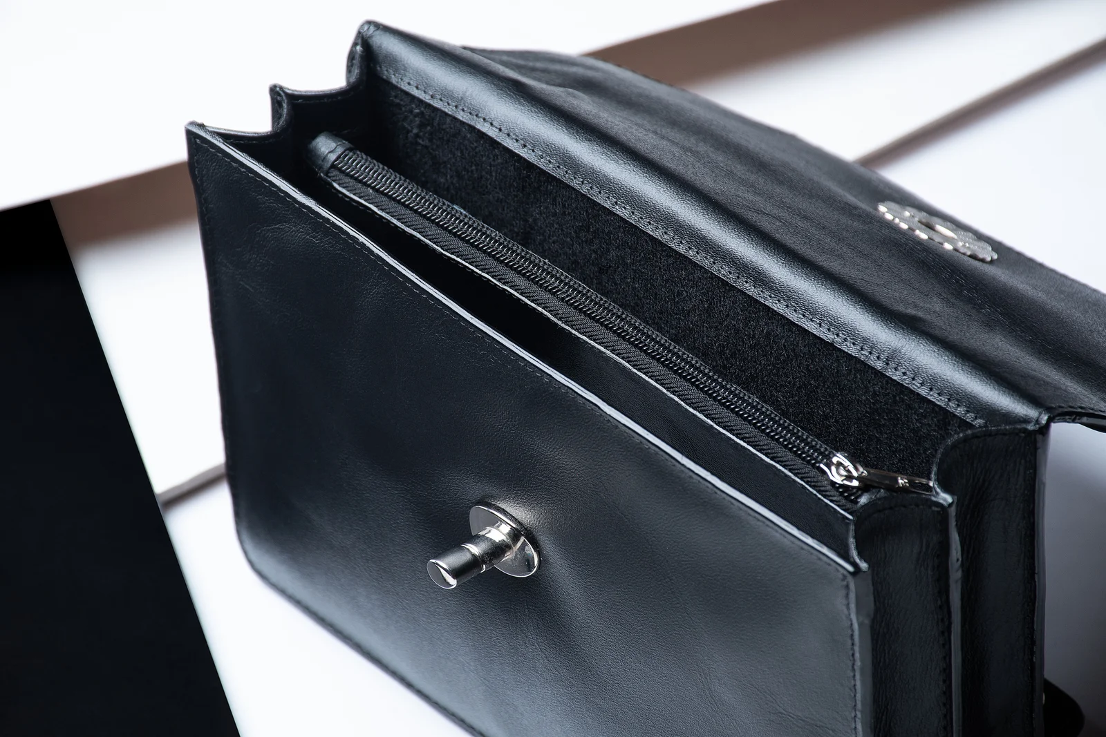 Step into the night with the Clutch Esmeralda from ECDISIS. Wear it as a long hip bag or a short clutch. It features an interior divider for organization, a pocket for documents, and a zippered pocket for valuables. Carry elegance and functionality wherever you go!